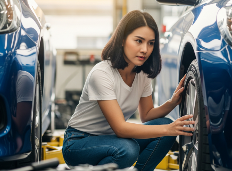 - ยางและช่วงล่าง : ตรวจสอบสภาพยางรถยนต์ว่าสึกหรอสม่ำเสมอหรือไม่ ดอกยางยังเหลือเยอะพอไหม ลองขยับล้อดูว่ามีเสียงผิดปกติ หรือรู้สึกหลวมคลอนหรือไม่